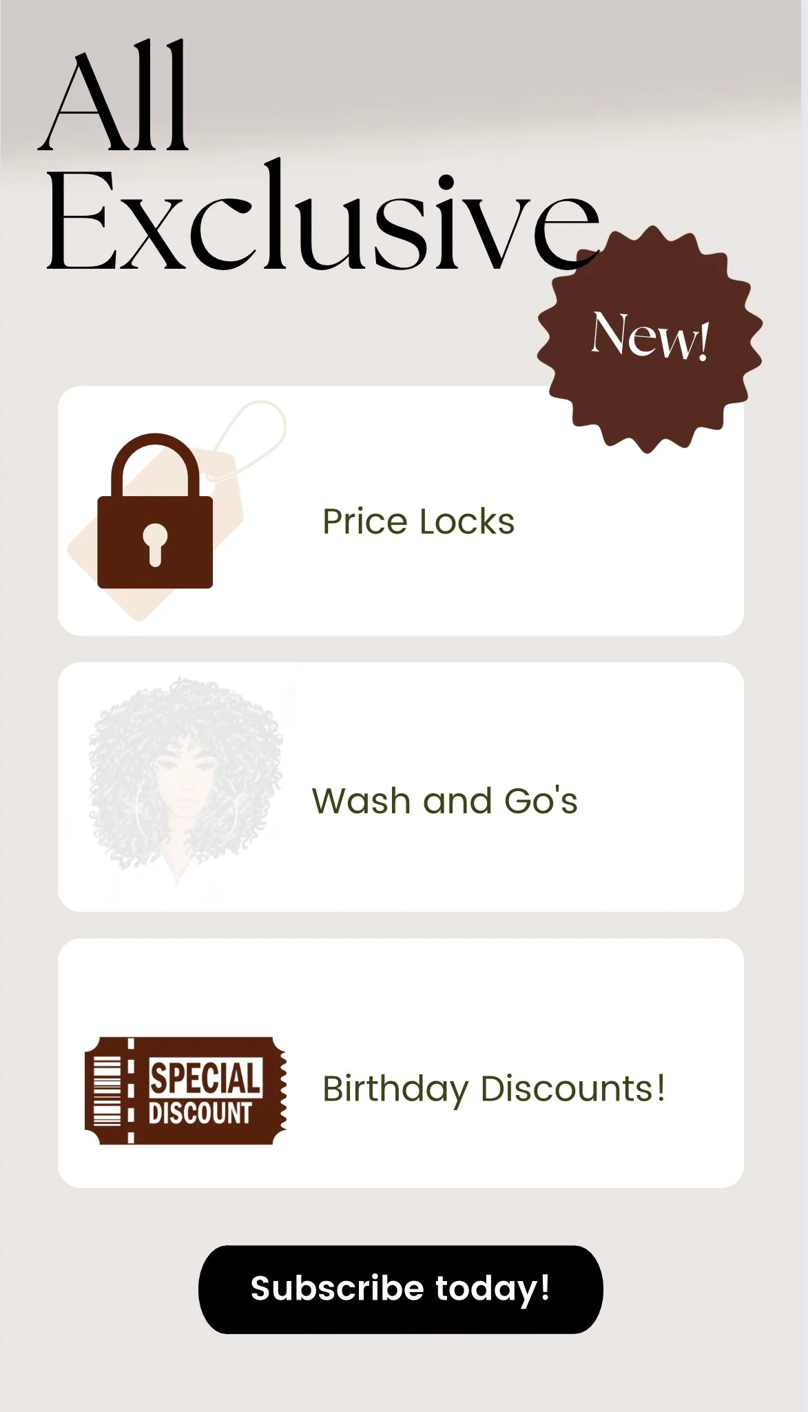 Become a VIP CURLY CUTIE and gain access to curly wash and go's, birthday discounts, price lock, and MORE!